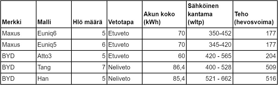 Niinkuin taulukosta ilmenee, jokaisen auton range, eli sähköinen kantama on hyvä. Huomionarvoista on se, että Maxus Euniq5 saa kuusipaikkaisena ja BYD Tangia saa seitsemänpaikkaisena.