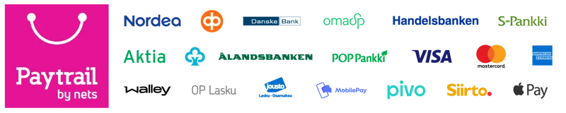 Maksunvälityspalvelun toteuttajana ja maksupalveluntarjoajana toimii Paytrail Oyj (2122839-7) yhteistyössä suomalaisten pankkien ja luottolaitosten kanssa. Paytrail Oyj näkyy maksun saajana tiliotteella tai korttilaskulla ja välittää maksun kauppiaalle. Paytrail Oyj:llä on maksulaitoksen toimilupa. Reklamaatiotapauksissa pyydämme ottamaan ensisijaisesti yhteyttä tuotteen toimittajaan.